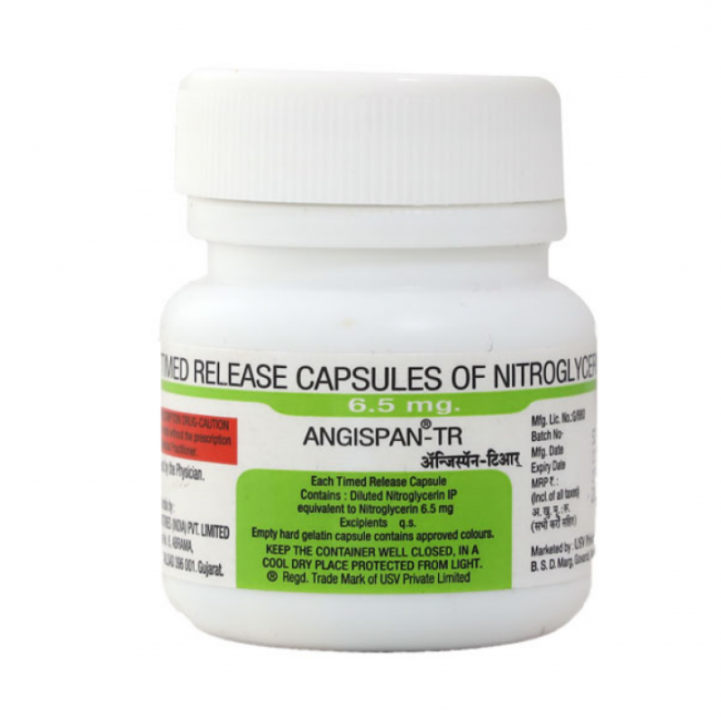 Angispan TR 6.5 mg contains Nitroglycerin in the oral form prescribed for treating angina or chest pain in people with certain heart conditions (coronary artery disease). Angina occurs when the heart doesn’t get enough oxygen and is more likely when the heart beats faster (such as during exercise or after eating). Nitroglycerin orally reduces the heart’s need for oxygen by lowering the heart rate, especially when an angina attack is more likely to occur.